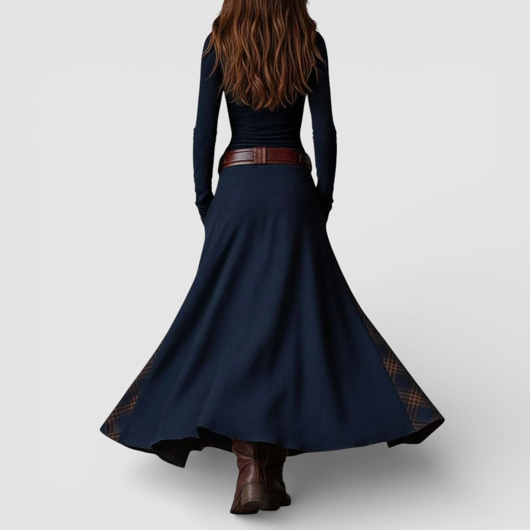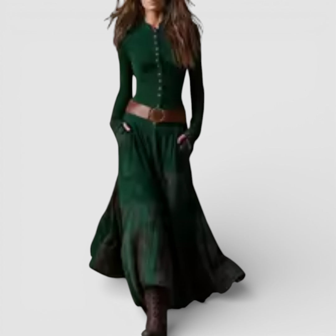 • Silueta a střih: Zúžený horní díl, sukně širokého spadení; maxi délka.