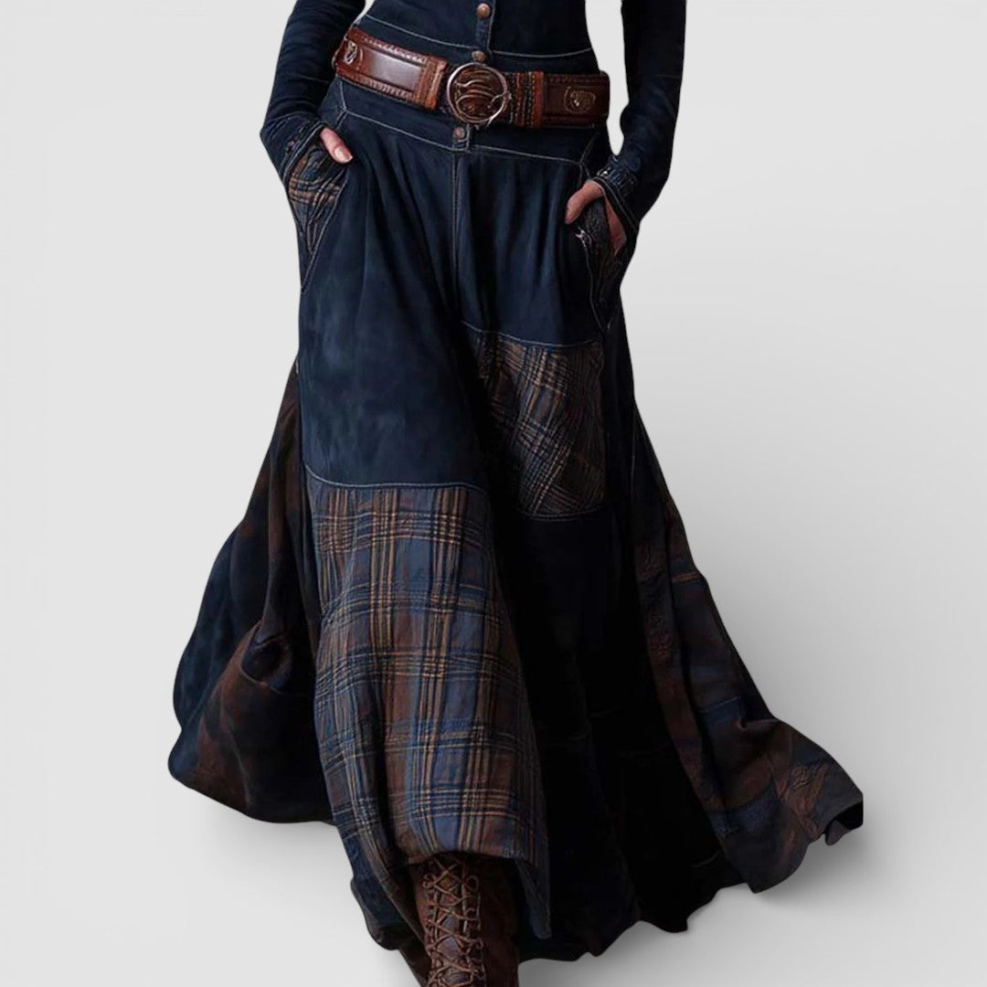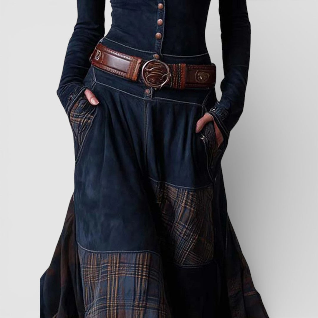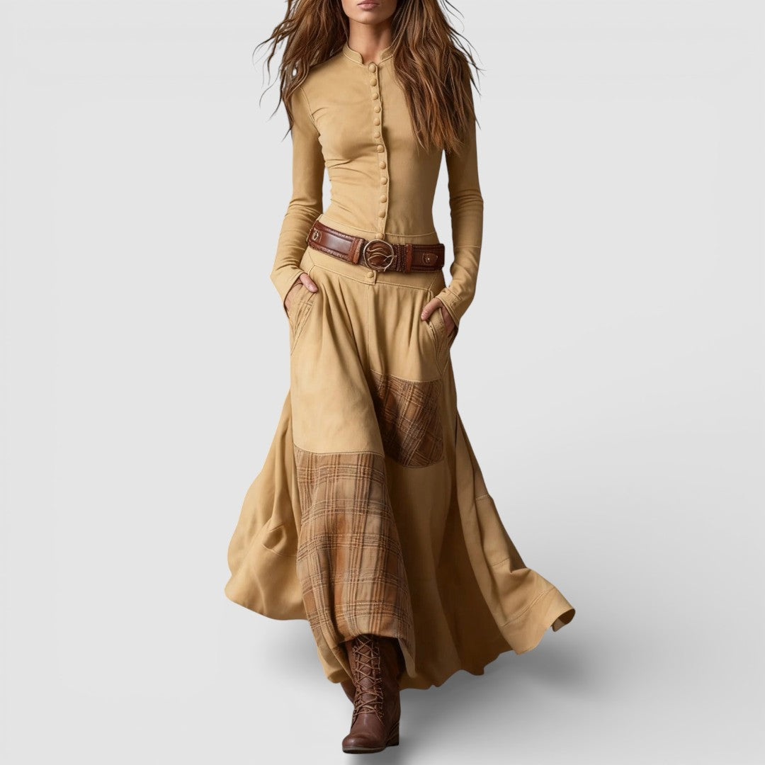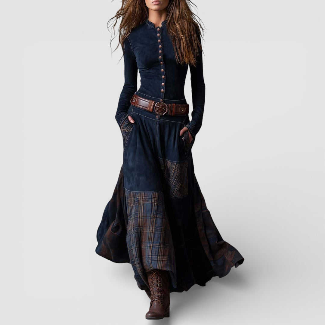 Elisa maxi šaty z broušené kůže s páskem přinášejí spojení mocné vintage elegance a bohémské subtilnosti. Měkký eko-velur a panely v zemitých a modrých tónech vytvářejí bohatou texturu, která doprovází každý váš pohyb, zatímco kvalitní zpracování se vyznačuje každým detailem.